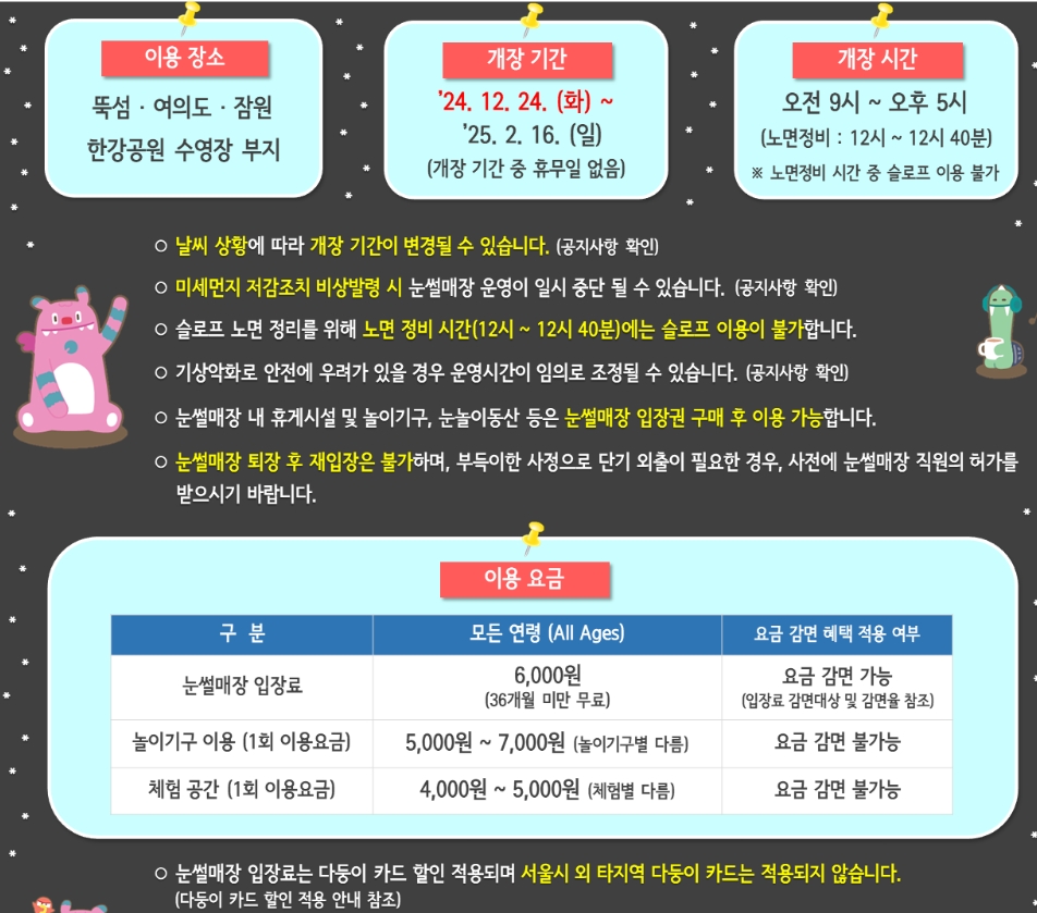 서울에는 다양한 눈썰매장이 있어요. 한강공원 눈썰매장, 서울랜드 등 여러 곳에서 즐길 수 있답니다. 특히 한강공원 눈썰매장은 도심 속에서 자연을 느끼며 즐길 수 있는 좋은 장소예요.