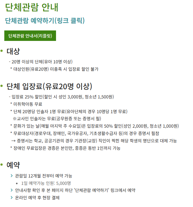• 20명 이상 단체로 방문 시 성인 기준 1,000원, 청소년 기준 500원의 할인이 제공됩니다.