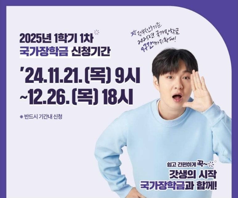 안녕하세요. 한국장학재단입니다. 2025년 1학기 국가장학금 1차 신청일정 및 신청 매뉴얼을 아래와 같이 안내드립니다. 가. 학생 신청: '24. 11. 21.(목) 9시 ~ '24. 12. 26.(목) 18시 까지 ※ 주말 및 공휴