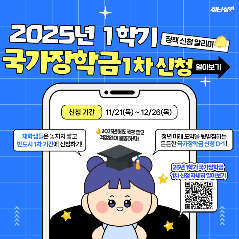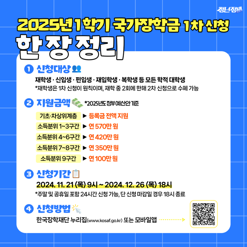 청년 친구들~ 안녕?(๑'ᵕ'๑)⸝* 📣2025년 1학기 국가장학금 1차 신청📣소식을 알려주러 왔...